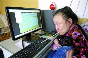 “风雨且狂啸,倾心韵律清新,清新,清新,写就奋斗精神……”短短21个字描绘出了一幅不畏艰难、奋力创作的场景。这是45岁朝阳女作家莹雪所填写的《如梦令·忆童年》中的一句词。莹雪原名王春辉,自幼身患重症,四肢无法自主移动,她没有上过一天学,在母亲的指导下自学成才,凭借口中的一只筷子,敲打键盘,潜心创作18年,完成了词集《词梦》,近日,饱含莹雪心血与艰辛的《词梦》终于出版,这是她10年间的第8部文集出版问世。莹雪眼含热泪:“我无悔往昔,一路走来,尽管一路走得很艰辛,我却感觉很充实快乐。我将乐此不疲地精心书写我的梦,用心灵之羽翼翱翔在文学的晴空里!”新书出版她喜极而泣一间刷着淡黄色墙裙的老式住宅里,堆满了各式书籍,房间一角,满头大汗的莹雪蜷缩在椅子上,正叼着筷子敲打着键盘,QQ中不时有好友闪动,临近中午,这是她和好友交流互动的时间。有好友得知她的《词梦》出版,纷纷向她道贺,莹雪含着筷子,不断重复抬头低头的动作,熟练地用筷子敲击着键盘,与好友分享这一令人喜悦的消息。莹雪介绍,《词梦》收录了她创作精选的旧体词260首,其中共有111个词牌,包括小令152首、中调60首、长调48首,这已是莹雪编著并自己设计封面、自己设计版式的第八部文集,也是她的第一部旧体词集。莹雪的母亲苗凤芹说,正月十四一大早,朋友李树清和作家魏德广就亲自开车,将免费为莹雪印刷的新书送来并搬到了楼上,让莹雪一家人都感动万分。莹雪自2007年以来共出版了8本文集,相继出版了《心语》、《絮语》、《吟草》、《追风》、《诗语》、《新梦》、《往昔》、《词梦》文集,共20多万字。创作楹联300多副、旧体诗1000多首、旧体词600多首、自由诗700多首、散文200多篇。“《词梦》其实在我创作其他文集的时候就已经开始了零散的写作,算下来已经有18年了,”看到多年的梦想实现,莹雪喜极而泣。克服重重困难练“口书”莹雪自幼患锥体外系疾病导致四肢瘫痪,虽然有知觉和控制意识,但是却不能自由支配四肢。1995年末,莹雪开始口叼笔写字。“我最初想得很容易,可轮到实际操作就难了。记得第一次叼笔时,就别说写了,连同头上的汗带嘴里的唾液都止不住往纸上流,没写多大一会儿,纸就湿透了,没办法只好重新换纸再写。”看着莹雪趴在床上满头大汗的样子,父母心疼地说:“你还是别写了,本来你每天身上的关节就很疼,又何必受这个罪呢?”而倔强的莹雪却抬起头笑了笑说:“爸爸、妈妈放心,我没事儿!”就这样大约练了十五六天后,她终于克服唾液往下流的毛病。渐渐地下笔写出字有了模样,就这样她坚持了两个月,终于可以写字了。2001年10月末,朝阳市残联赠给莹雪一台电脑,于是她开始学习操作电脑。正常人用十指操作电脑,而莹雪只能用口叼一根筷子操作,起初非常难。拿移动鼠标来说,就是一道很难过的关。当莹雪用筷子去移动鼠标时,鼠标就像长了腿似的,“我刚低头移动一下鼠标,再一抬头,屏幕上鼠标的箭头就不见了,于是我又开始找箭头,还没等找到箭头,汗水早已喷涌出来,把眼睛都遮盖了,于是,我使劲甩了几下头,把汗甩到别处后,继续坚持操作。”父母看到莹雪大汗淋漓的样子很是心痛,她又宽慰父母说自己没事。就这样苦练一个星期,终于把鼠标这道难关给攻下了。又过了不到二十天,口叼筷子操作电脑基本学成。就这样,莹雪学会了使用电脑。自从学会了电脑,写作的速度明显提高。从原来口叼笔每天写百余字的诗,直到如今日输千余字的文章。母亲指导自学成才莹雪自幼患病,母亲苗凤芹对她也是竭尽全力。莹雪说,母亲经常讲起她儿时的事情,她记得母亲说,在她两岁的时候,母亲请了3个月的假,带她到沈阳看病,父亲一人继续上班。每到医院打针,莹雪都会大哭一场,为了不让她感觉打针太痛苦,母亲想出一个分散她注意力的办法。看到莹雪眼泪汪汪的眼睛,还有正撇着的小嘴儿。母亲把她抱在膝上,温柔地对她说:“我们背诗好不好?”莹雪哽咽着问:“背诗,扎针能不疼吗?”母亲说:“妈妈也不清楚,我们试试吧。”因为母亲知道莹雪最渴望就是病好,能和其他孩子一样蹦蹦跳跳地走,所以母亲继续说,“不是有一句俗话说‘学会唐诗三百首,不会作诗也会走’吗?”“走”这是母亲故意把“诌”说成了“走”。从此,母亲就开始每天教莹雪背诗。“或许冥冥之中的安排,在我背诗时,打针似乎真的不太疼了,从此以后我也不再哭闹。”莹雪回忆道。从沈阳回来后,母亲经常抽时间或者教她背诗、或者念童话故事。“通过母亲的循循善诱,让我走进了一片属于自己的优雅晴空。这样的启蒙一直持续到我学会自己查字典。后来由于工作与家务繁忙,母亲转而让我独立管理自己每一天的学习。从那时起,我就养成了自主安排学习的习惯,直到现在。”“那时的我,父母不忍心直言告诉我,残疾已然注定。我却隐约感觉到,有可能我的病今生不会治愈,我那个幻想很久的上学之梦,将永无梦圆之时。我今后唯一希望就是向张海迪那样努力自学,或许才能实现使自己活得有自尊、有价值的夙愿。”莹雪把张海迪作为自己的榜样。网络交流不提身体状况早在1998年,莹雪开始投稿,当年年底便有稿件被发表,莹雪看到自己的努力被认可,更是每日早起晚睡专心创作。2005年9月,莹雪经一位新加坡华人文友的介绍,认识了一批加拿大华人朋友