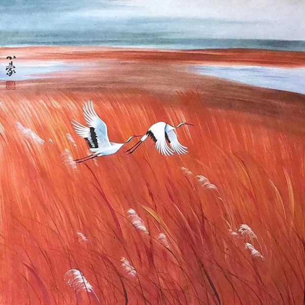 草赤秋浓泛雪花,惹来飞鹤欲安家。