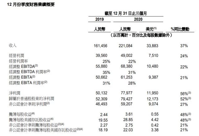 财报显示,截至2020年12月31日的该季度,阿里巴巴实现收入2210.84亿元,同比增长37%;经营利润490.02亿元,同比增长24%;经调整EBITDA (息税折旧摊销前利润)683.80亿元,同比增长22%;经调整EBITA(息税前利润)612.53亿元,同比增长21%;净利润779.77亿元,同比增长56%;归属于普通股股东净利润794.27亿元,同比增长52%。