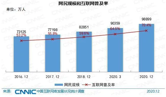 报告显示,截至2020年12月,中国网民规模为9.89亿,较2020年3月新增网民8540万,互联网普及率达70.4%,较2020年3月提升5.9个百分点。