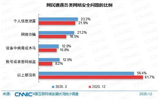 其中,遭遇网络诈骗的网民比例较2020年3月下降4.6个百分点;遭遇账号或密码被盗的网民比例也较2020年3月下降4.3个百分点。