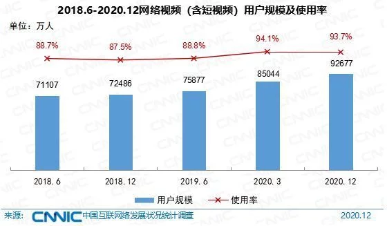 截至2020年12月,中国网络视频用户规模达9.27亿,较2020年3月增长7633万,占网民整体的93.7%。其中短视频用户规模为8.73亿,较2020年3月增长1.00亿,占网民整体的88.3%。