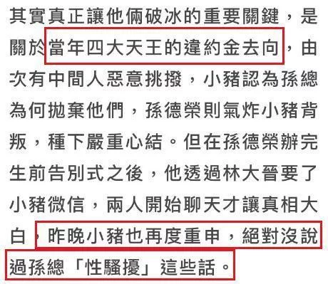 而如今真正让他们和解的关键,是关于当年四大天王违约金去向,经有人恶意挑唆,罗志祥认为孙德荣抛弃他们,而孙德荣则生气认为遭到罗志祥背叛。
