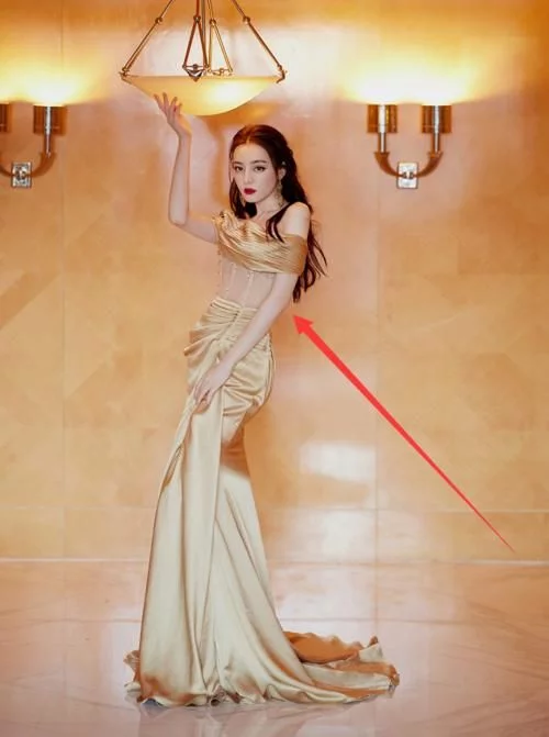 热巴整体造型采用的是金色,给人感觉很高贵,她的下半身穿的是拖地长裙,但上半身则是真的用了一块儿布条做上衣的。热巴的这件上衣很好的秀出了她的直角肩和锁骨以及纤细的天鹅臂和小蛮腰,该秀的地方全都秀出来了。