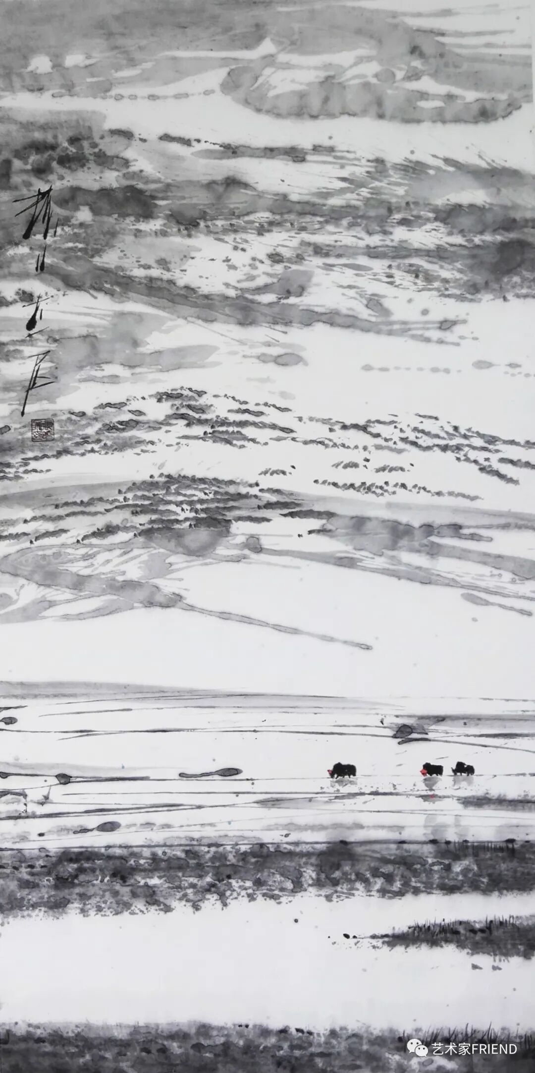 画家选择丰富多变的水墨语言,以恣意狂放的草书笔法兼用当地藏族硬笔(竹笔)的勾线技巧,结合浓淡虚实的泼、点墨用色变化,塑造出体魄坚阔壮实、长毛披风野性张扬及闲适安静温存母性十足的高原图腾--牦牛的群像图景。笔墨神韵和意境高度融合,浑然天成。