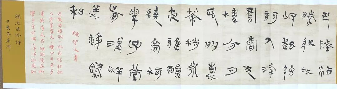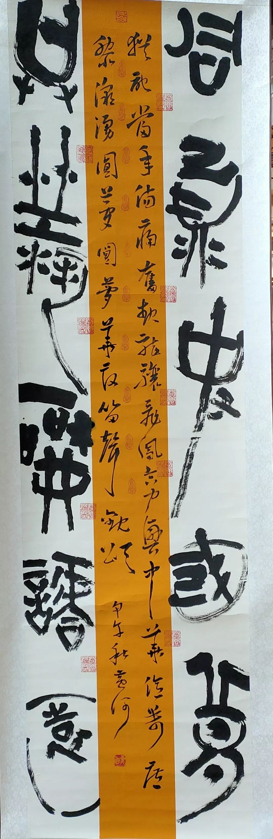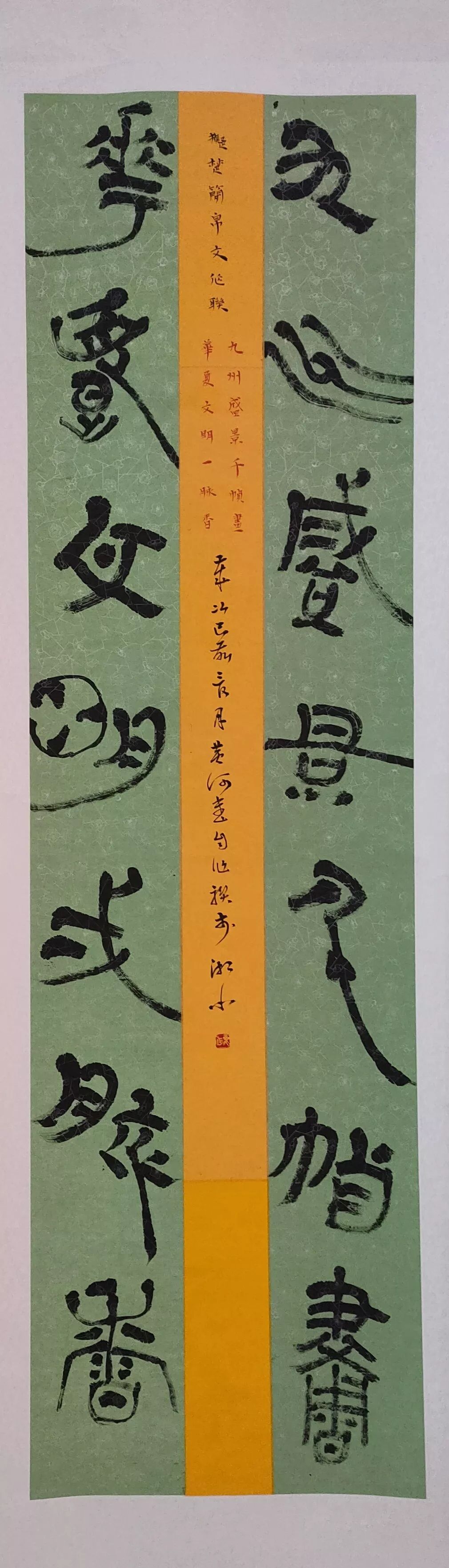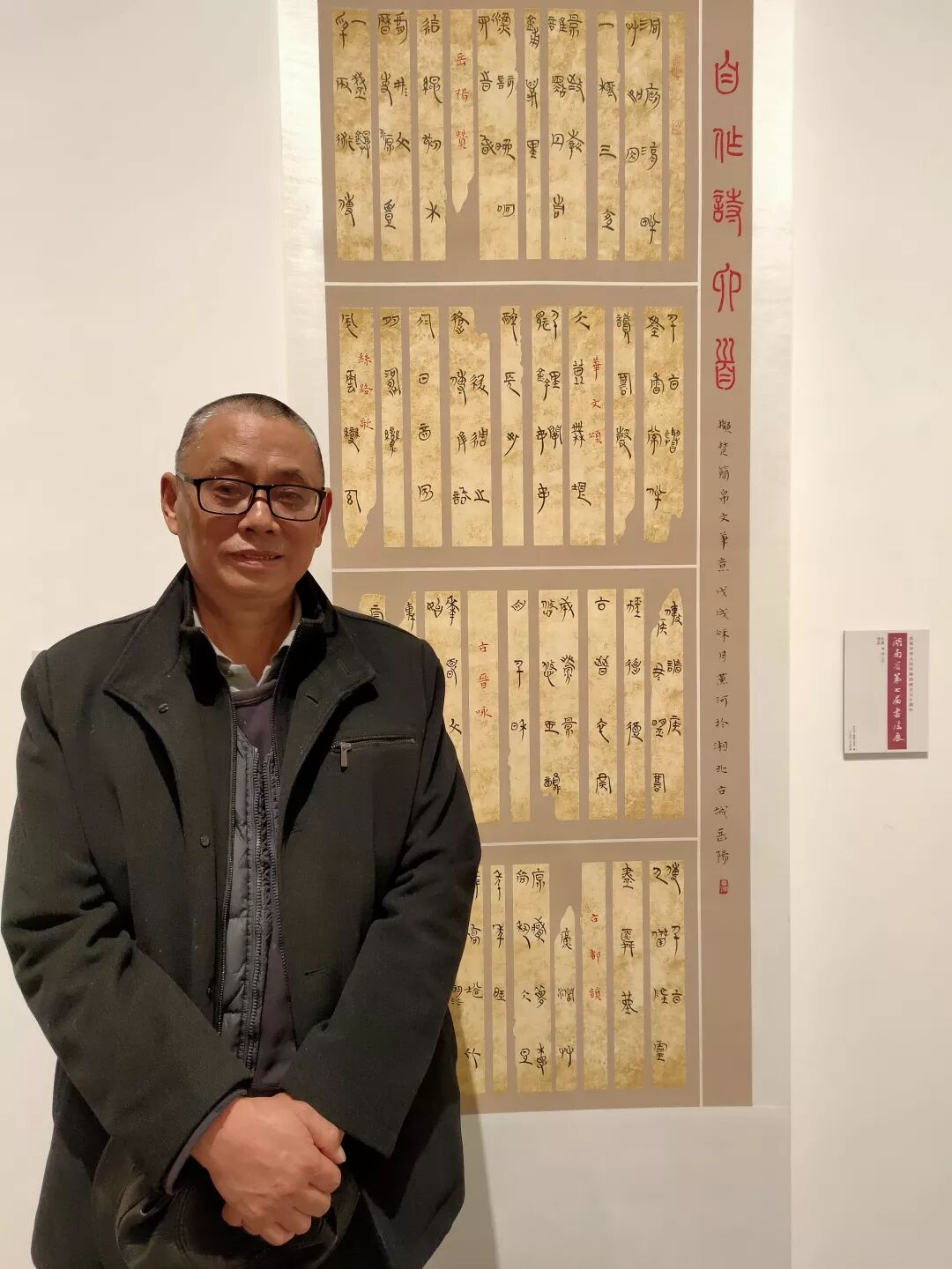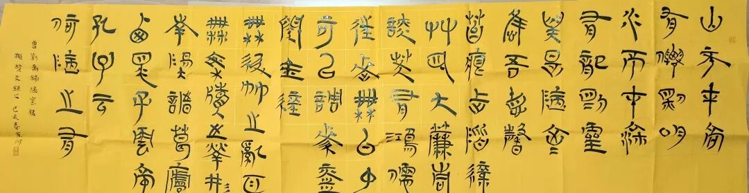 黄河老师的书法作品涉猎甚广,楷、隶、行作品古雅高阔,楚简更是章法新奇,气韵天成。曾以一幅楚简条幅一举摘取了全国“第八届书法篆刻作品展”同类作品唯一的“全国奖”桂冠。他的大字,特重笔力,起止提按均让人感觉每一笔都在心在意更在法度。说到书法,无法度不足观,拘泥法度亦不足观。黄河老师的书法,师法古人,冬晨夏晚,枯坐以对古人法帖,以寂寥之心认真揣度古人笔法,观其最近的书法,其精神面貌,是运笔如椽,力破整齐,笔势得阳刚之美,咄咄逼人,是渐入古人先贤堂奥,正在慢慢形成自己。黄河老师以前人的精神与法度滋养自己,其所受益,直接表现在他近来的书法作品里。在书坛的当下,以书法的风貌而言,黄河老师是猛看一般越看越好的书家之一。