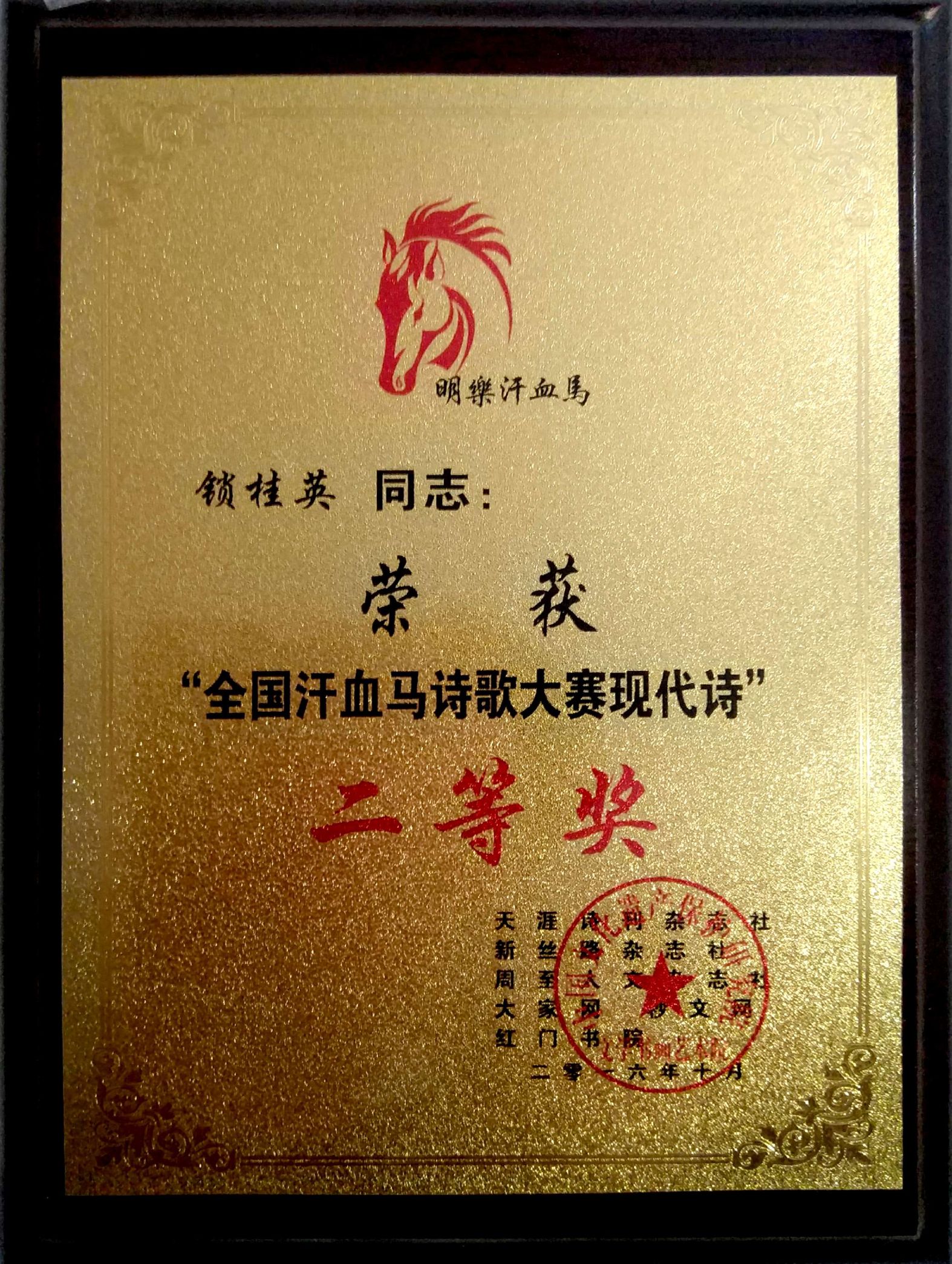 [喜庆恭贺] 恭贺锁桂英同志荣获”全国汗血马诗歌大赛现代诗“二等奖