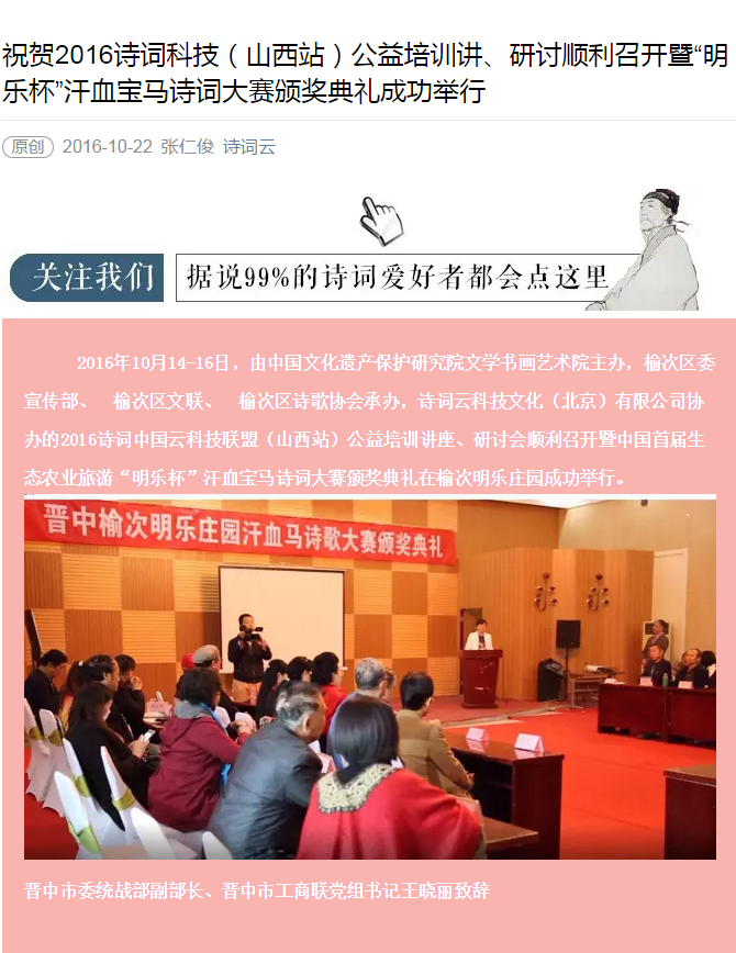 祝贺2016诗词科技(山西站)公益培训讲、研讨顺利召开暨“明乐杯”汗血宝马诗词大赛颁 ...