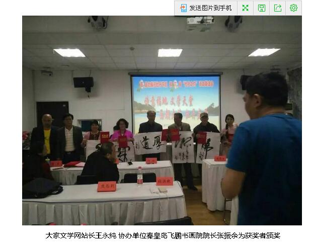 大家网站长王永纯和秦皇岛飞鹏书画院院长张振余为获奖者颁发证书和奖品