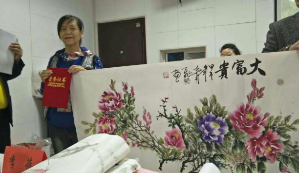 全国首届牡丹节征文大赛三等奖获得者高丽敏领取证书和奖品
